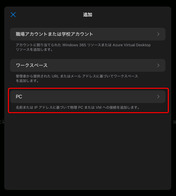 「追加」画面で「PC」を選択。