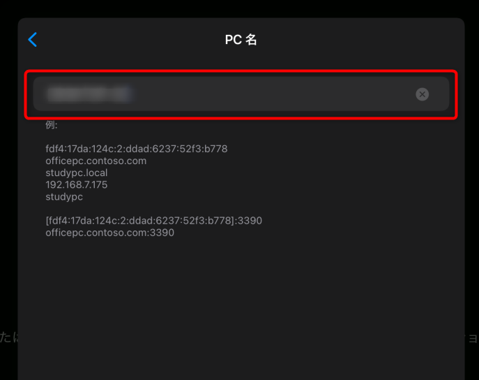 Windows 側の設定画面で先ほどメモしておいた「PC名」をここで入力する。