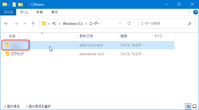 にアクセスして表示されるユーザーフォルダ名から確認できます。