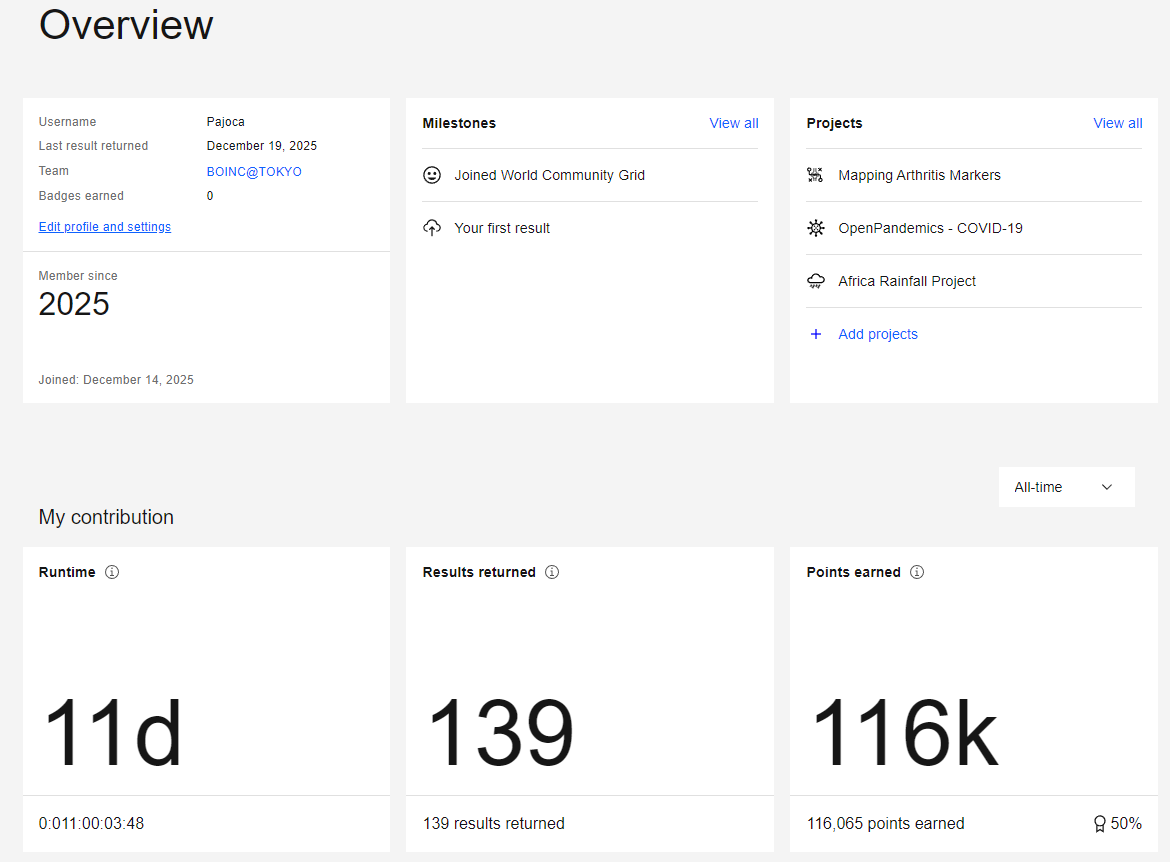(PrimeGridで私は BOINC@TOKYO というチームに所属しているので、World Community Grid でも BOINC@TOKYO で参加してみようと思います。